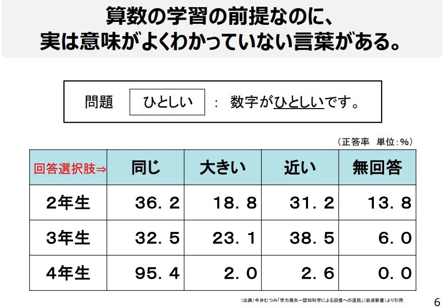 たとえば、算数でよく出てくる「ひとしい」という言葉。今井さんが調べたところによると、じつはこの意味を理解していない小学生が結構いる💦